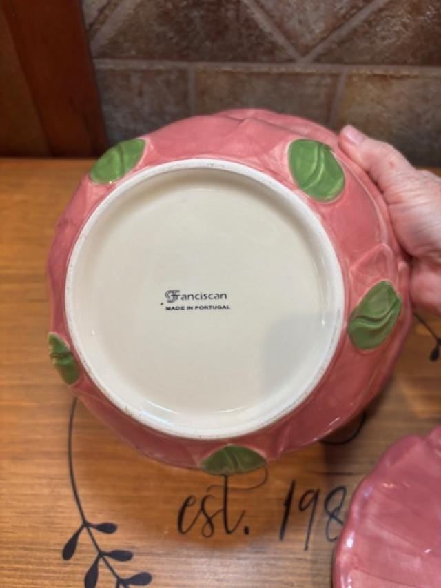 Pattern is called Desert Rose and it is made by Franciscan in Portugal. Cookie Jar has the Made in Portugal backstamp on the bottom. Desert Rose in Portugal was produced between 1985-2003. The pattern depicts a sculptured pink rose with bright green leaves. The yellow handle is the center of the flower.