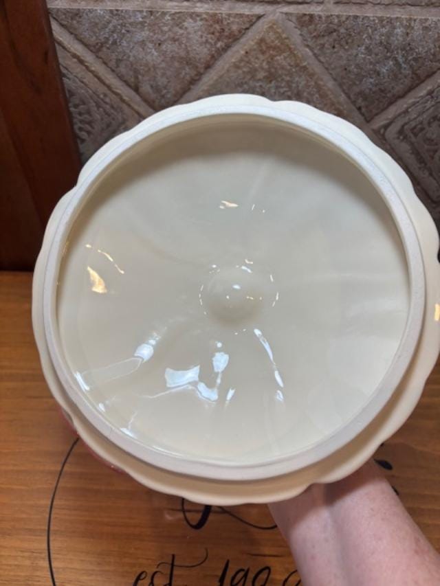 Cookie jar is in excellent used condition with no chips, cracks or scratches. It is approximately 8 1/8" in height to the top handle of the lid and 9 3/4 inches at the widest width. It is made out of Earthenware.