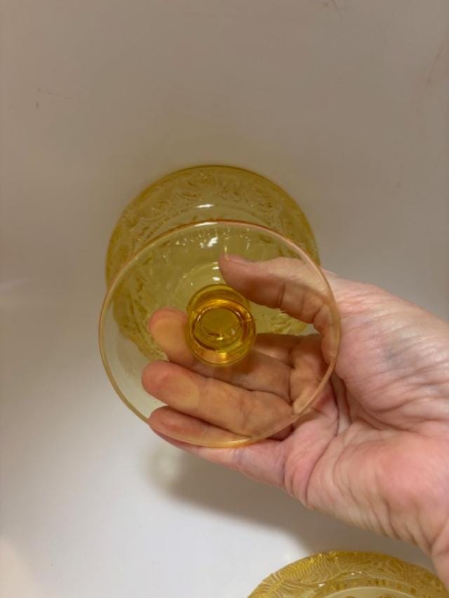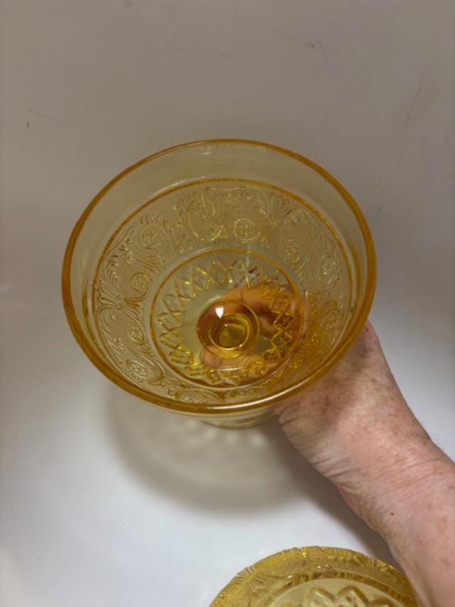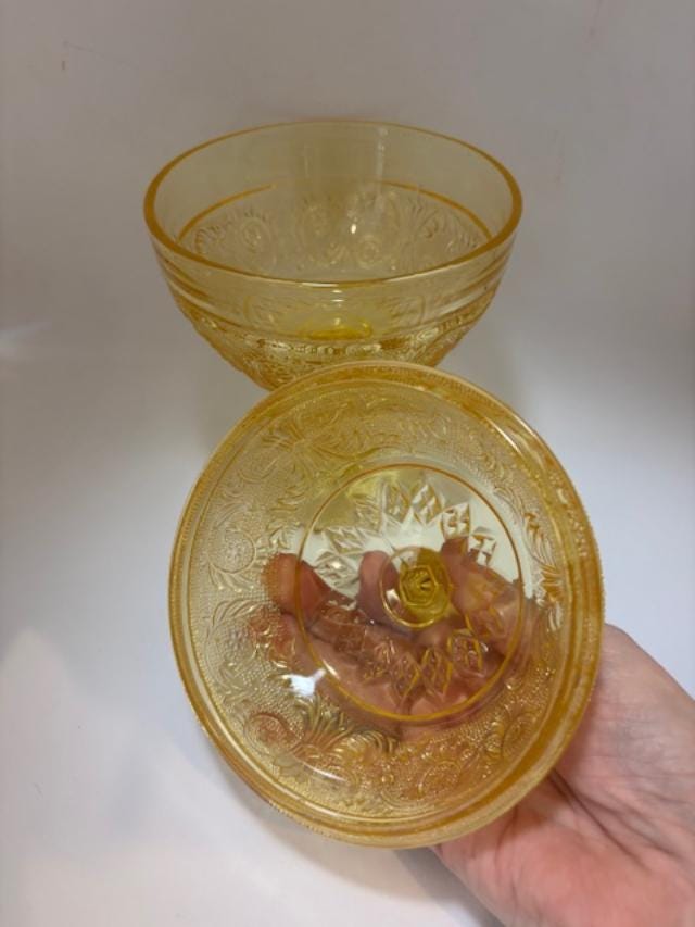 This candy dish is in excellent used condition with no chips, cracks or scratches. It is just gorgeous and was made by Duncan & Miller of the United States. It is the Sandwich Yellow pattern which depicts a scroll design.