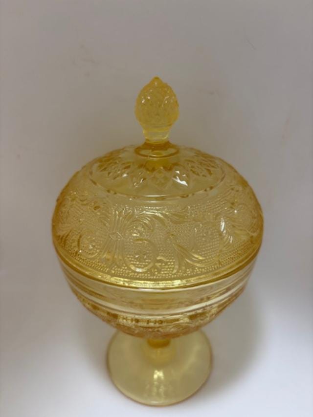 Item is a beautiful light yellow amber color and is approximately 8 1/2" in height to the top of the finial on the lid. It is 5" wide at the widest part of the base.