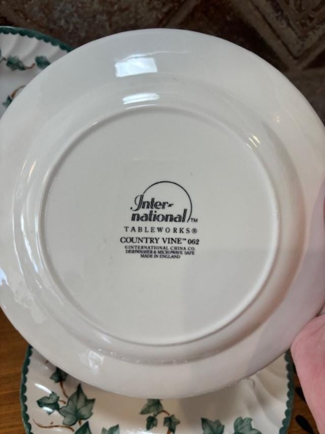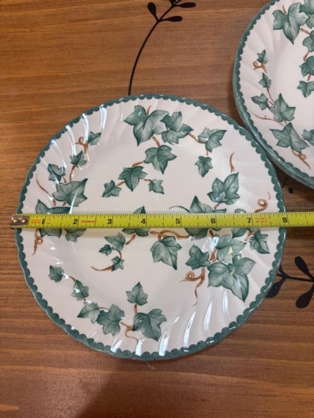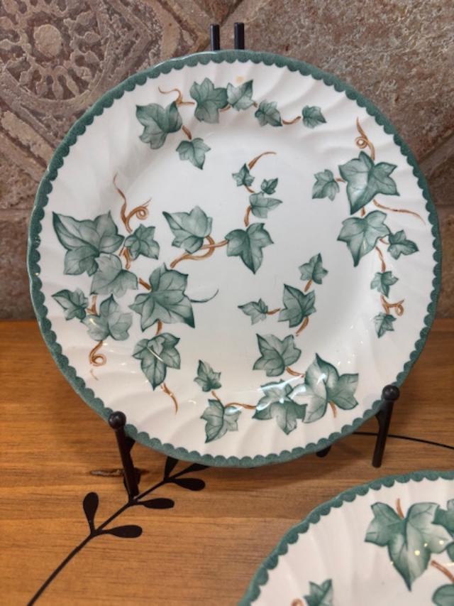 Made by International between 1992-1995, the pattern is called Country Vine and is from England. Each of these salad plates is 8" in diameter with a green ivy pattern.