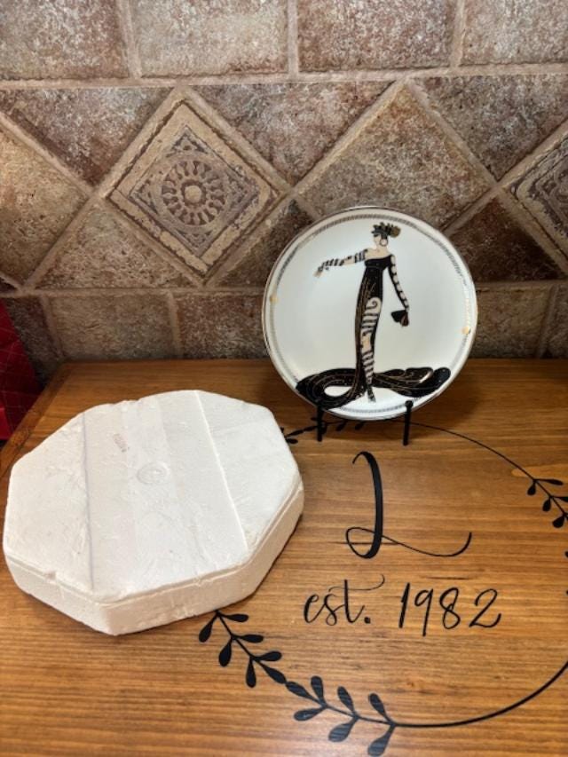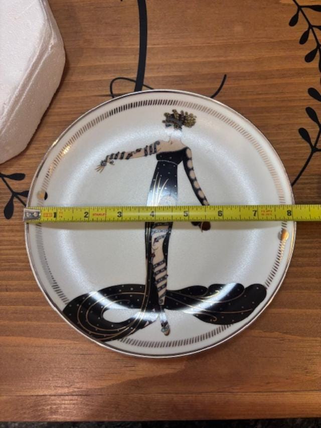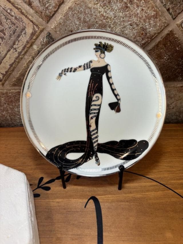 Made by the Franklin Mint in 1995, this House of Erte' 8" plate depicts a Parisian lady dressed in a long flowing black dress and shows her leg and arm adorned in almost serpent like jewels. The design was taken from the Russian-born French artist Erte' who was a leading artist of the Art Deco movement. Erte' designed elaborate Art Deco style costumes for such renowed actresses as Joan Crawford and Lillian Gish. The plate is numbered HG8150 and has the Certificate of Authenticity included. The border and the hand numbering are done in platinum.
