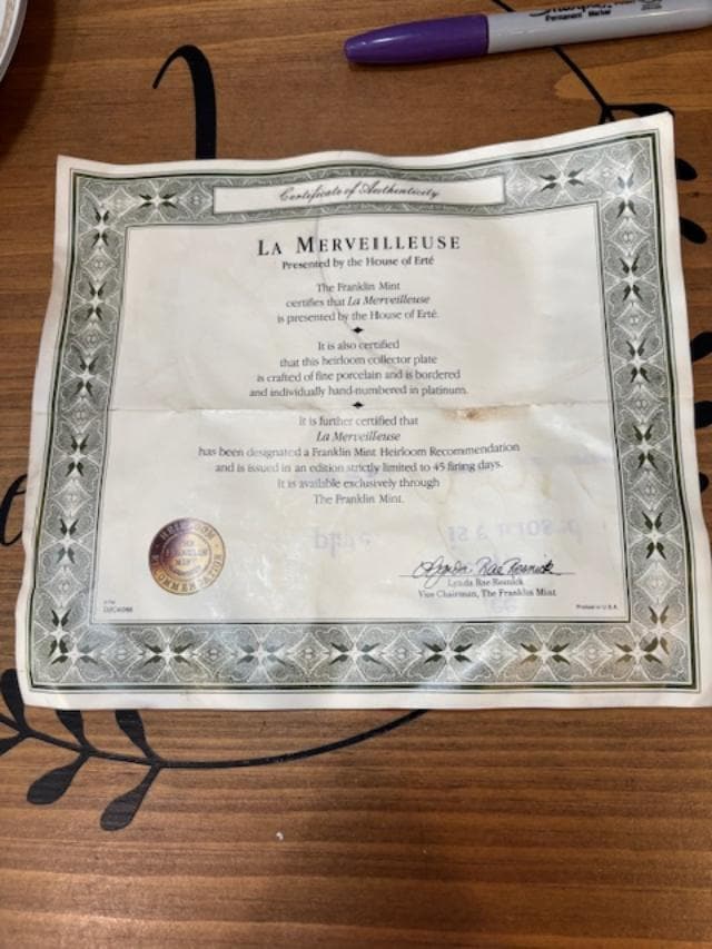 Limited Edition House of Erte' La Merveilleuse Collectors Plate Franklin Mint COA Included