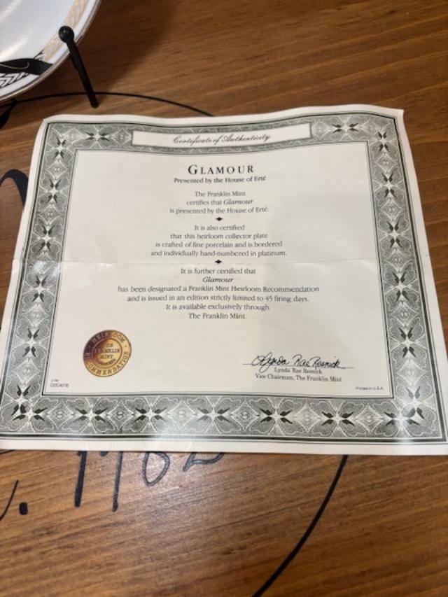 Limited Edition House of Erte' Glamour Collectors Plate Franklin Mint COA Included