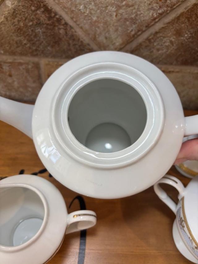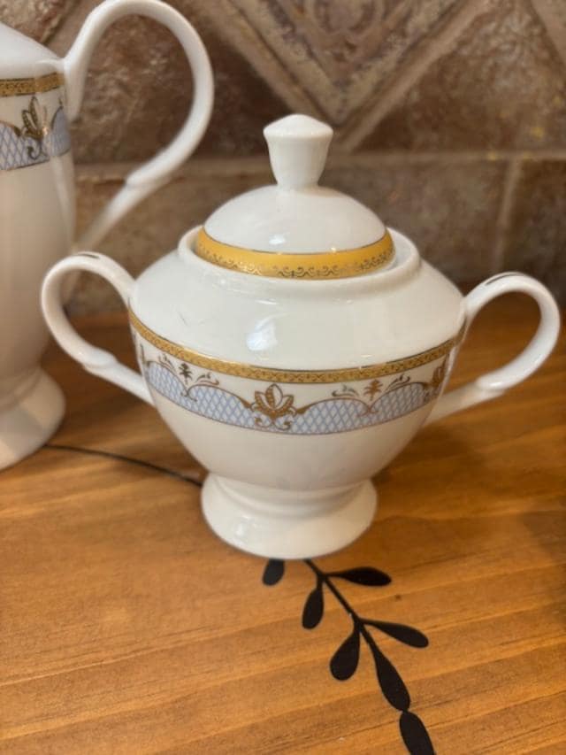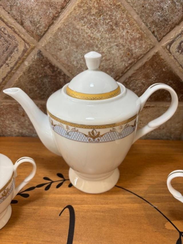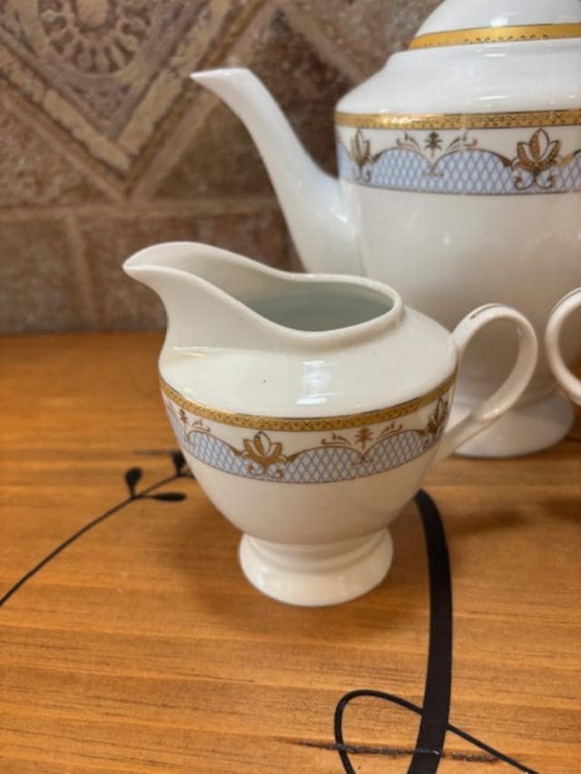 Set includes Tea Pot/Coffee Pot with Lide, Sugar Bowl with Lid and Creamer. We are not sure of the pattern or when it was manufactured. The pattern is a light blue crosshatch with gold swags and gold accents and rims.