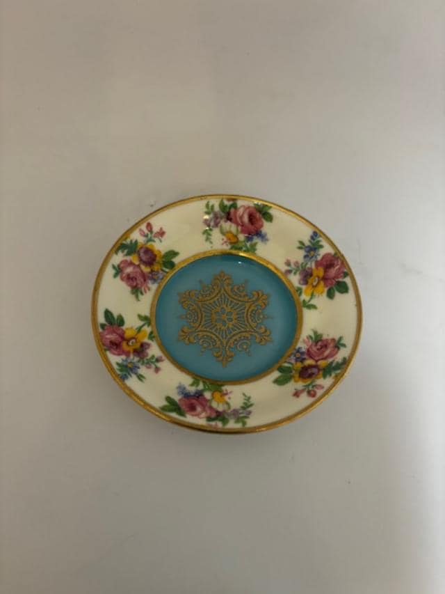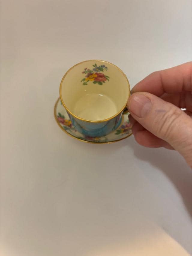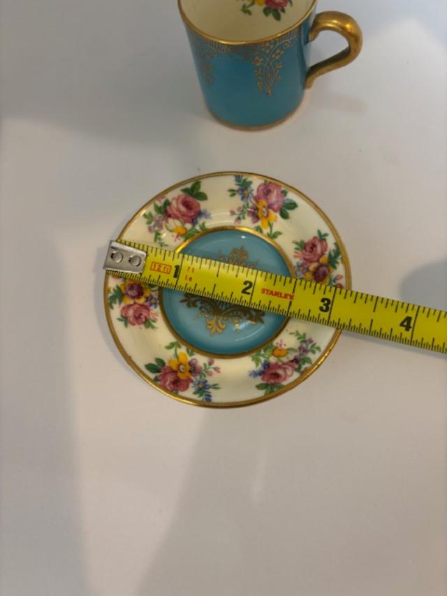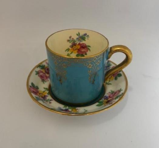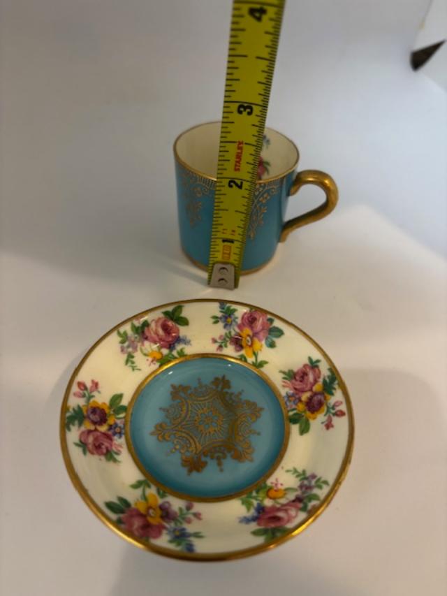 Made by Paragon of England by appointment to H.M. the Queen and H.M. Queen Mary around 1930, this fine bone china sky-blue demitasse cup features brightly colored flowers on the inside of the cup and on the saucer. The cup is 1 3/4" in height with a 1 3/4" opening. The saucer is 3 1/8" in diameter. Gold rims and the gold handle of the cup have no wear or gold loss.
