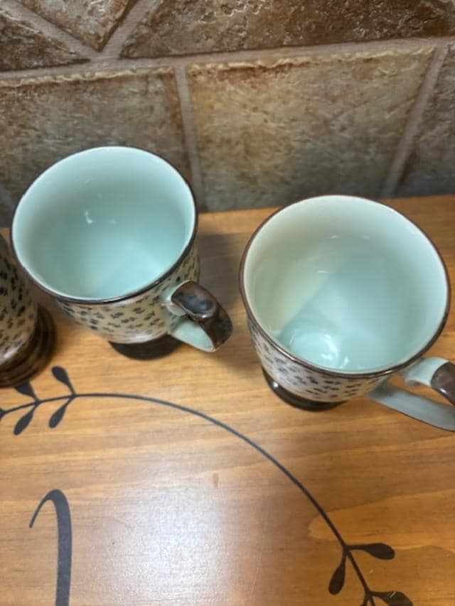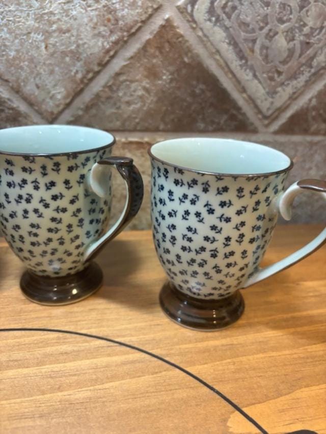 Set of Four (4) Arita Japan Green and Blue Pedestal Mugs Small Flower Pattern