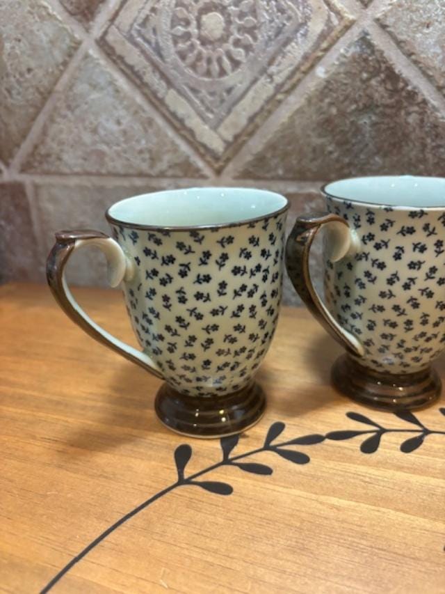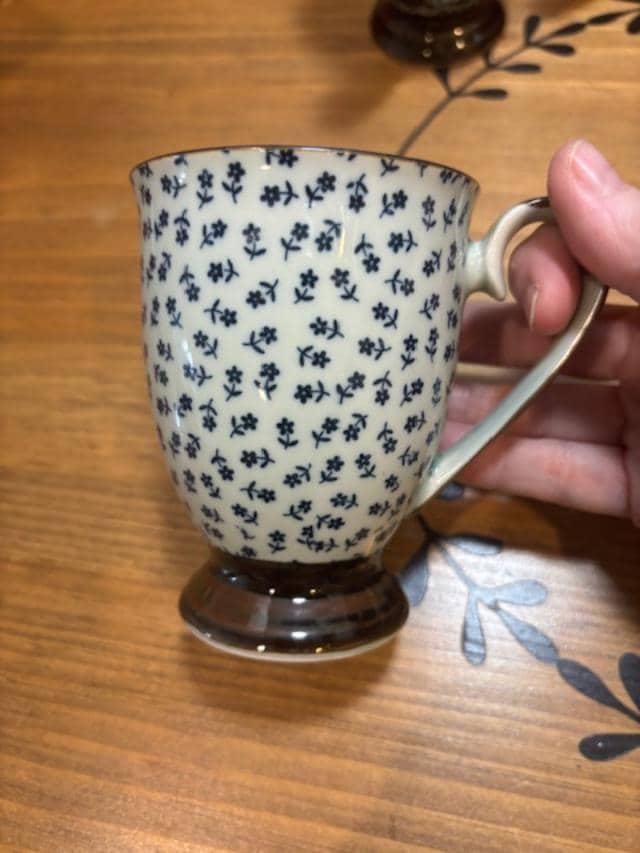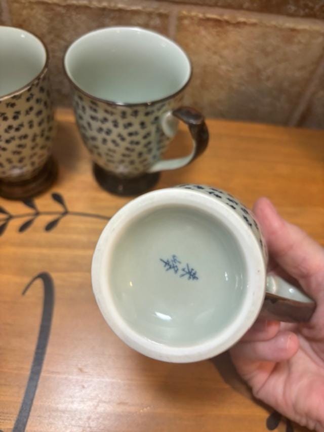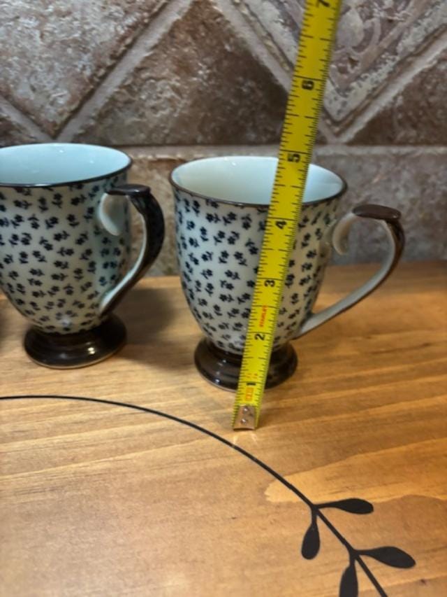 Made by Arita of Japan, the cups have a green background and bowl with small blue flowers throughout. Each one is approximately 4 1/8" in height, 3 1/8" at the rim, and holds 9 ounces of your favorite tea or coffee.