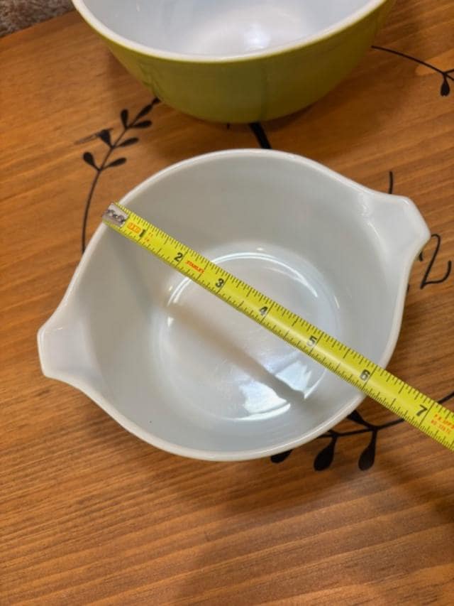 Casserole dish is #473, 1 QT and is approximately 6" in diameter and 3" in height. It DOES NOT have a lid. The mixing bowl is #405, 2 1/2 QT and is approximately 8 1/2" in diameter. Both are the beautiful avocado green color that was so popular in the 70s-80s.