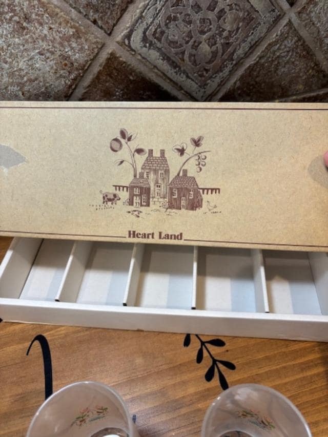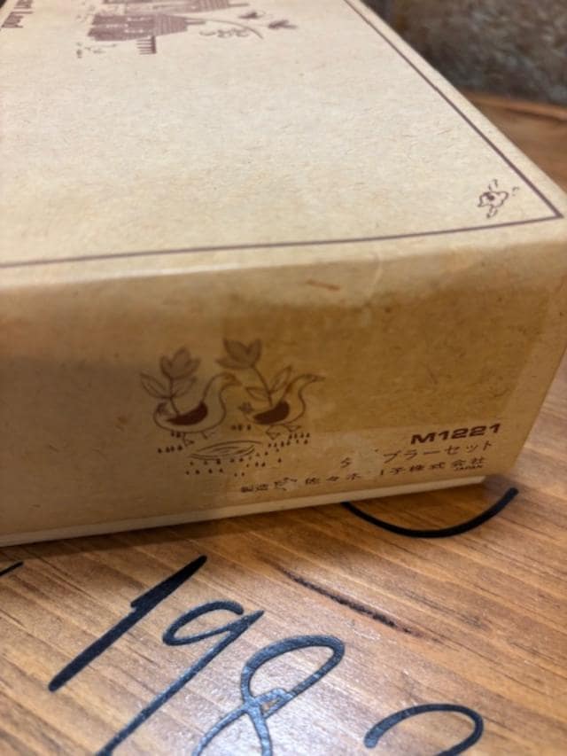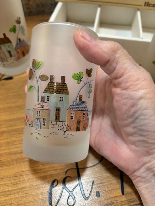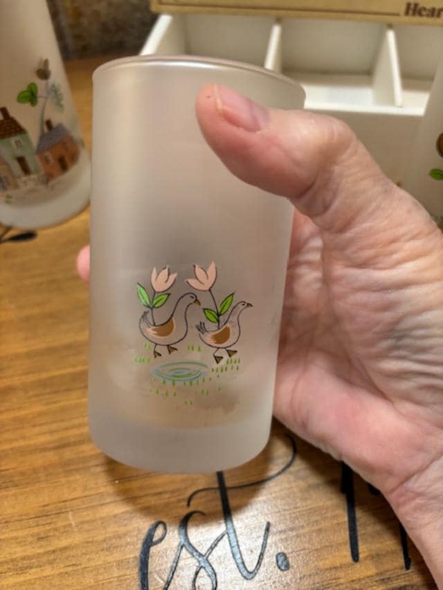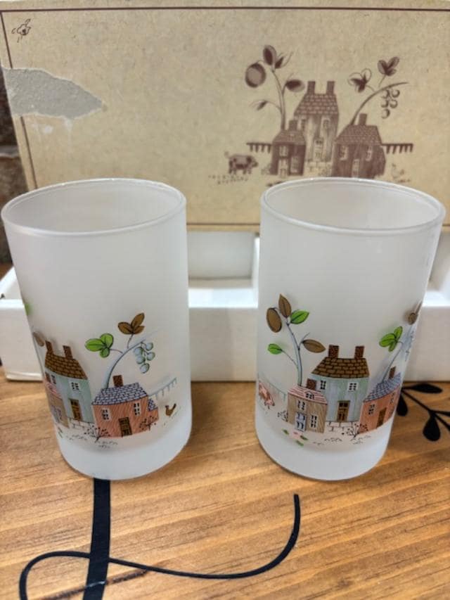 Made by Sasaki Glass Japan between 1986-1999, the pattern is called Heartland which depicts farm houses with animals on the front and two ducks on the backside.