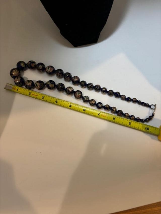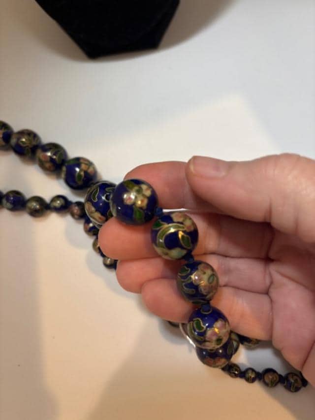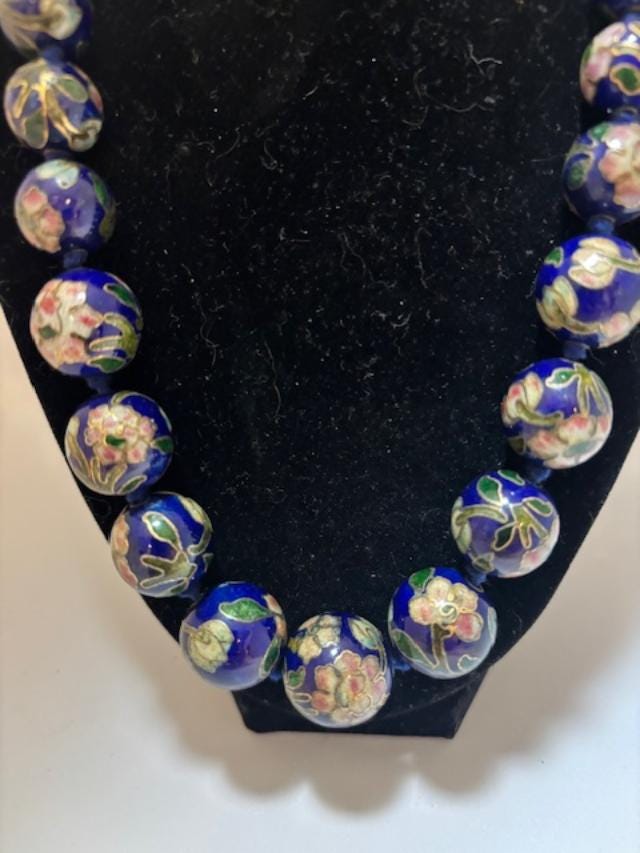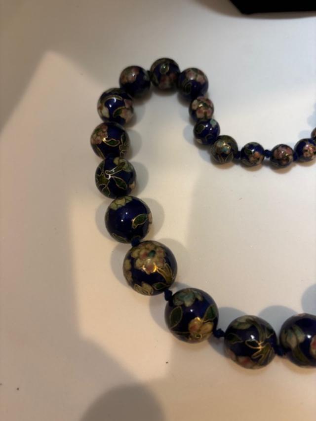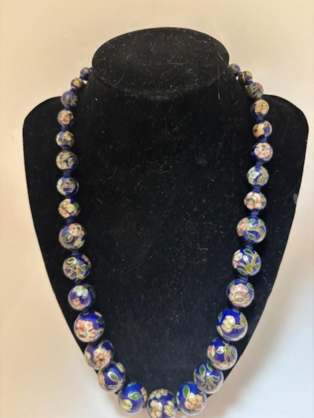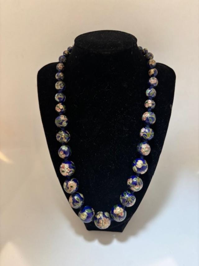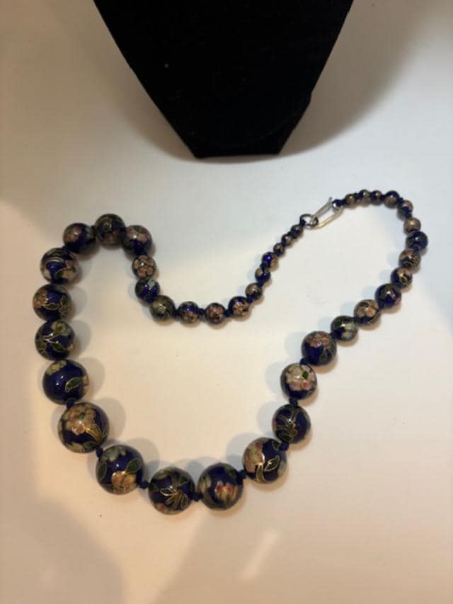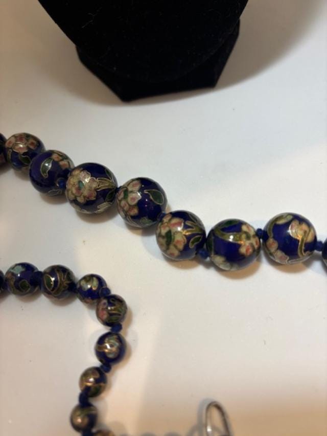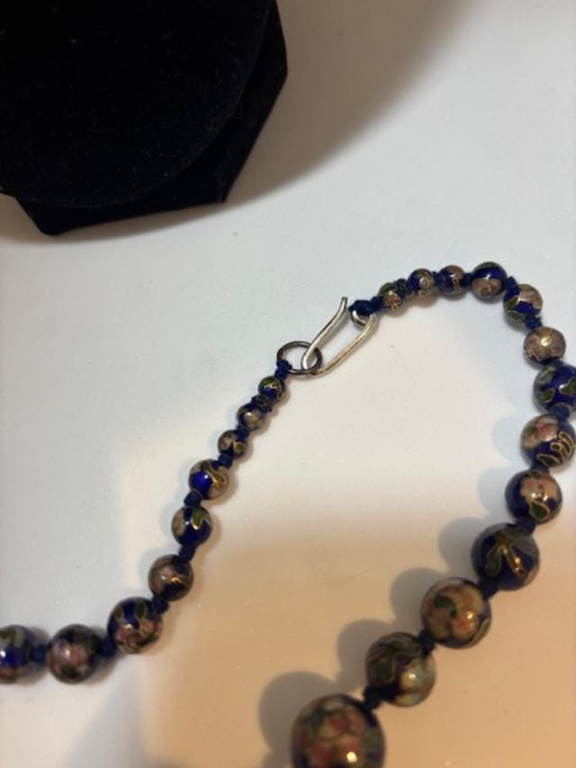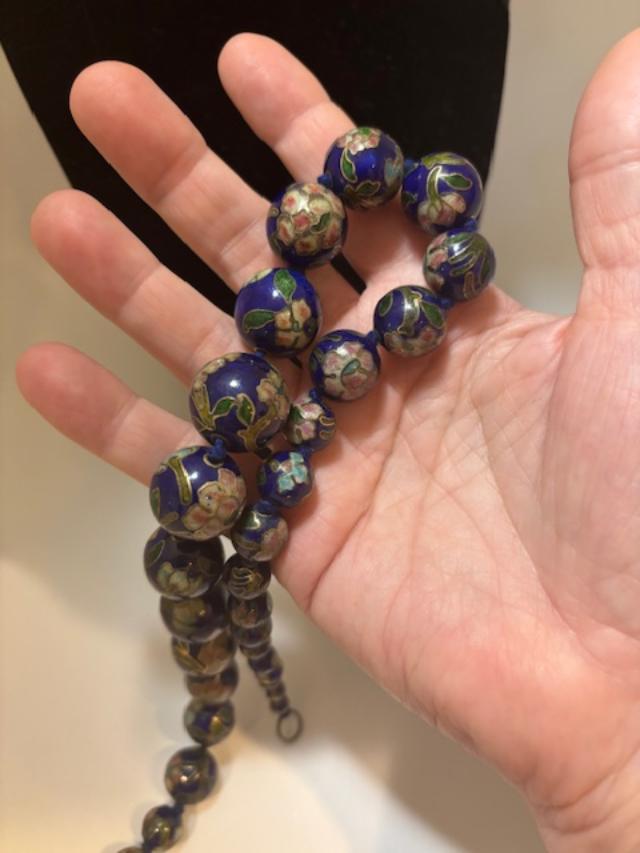 It is approximately 22" in length with round cloisonne stones of bright cobalt blue. Each of the stones has a hand knotted loop in between.