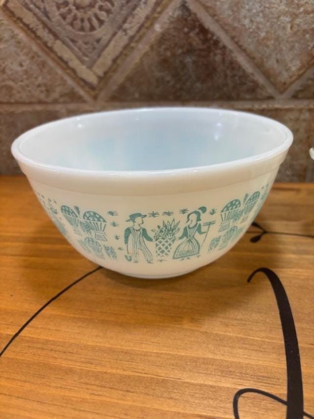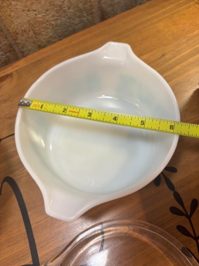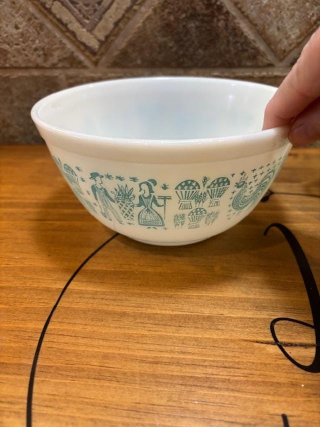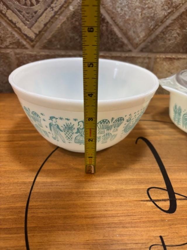 All pieces are in good used condition - the mixing bowl pattern is a little lighter, the top of the casserole dish does have some scratches due to use.