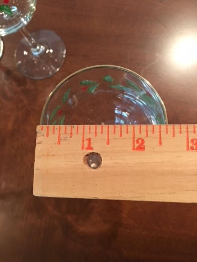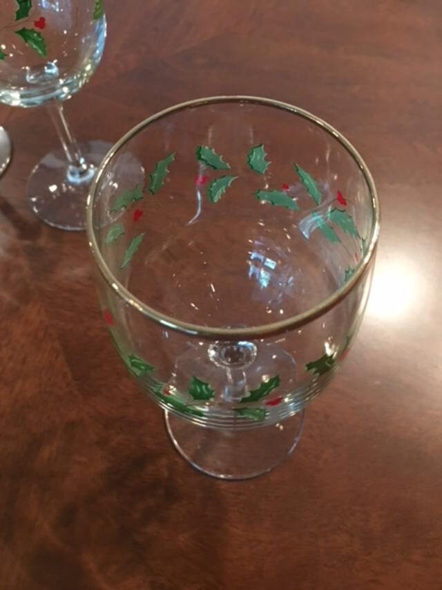 These 10 ounce water wine goblets are each 7 1/2" tall and 2 5/8" wide at the mouth of the glass. They display a festive green holly and an almost iridescent red berry pattern. Each has the "thin" gold band at the rim.