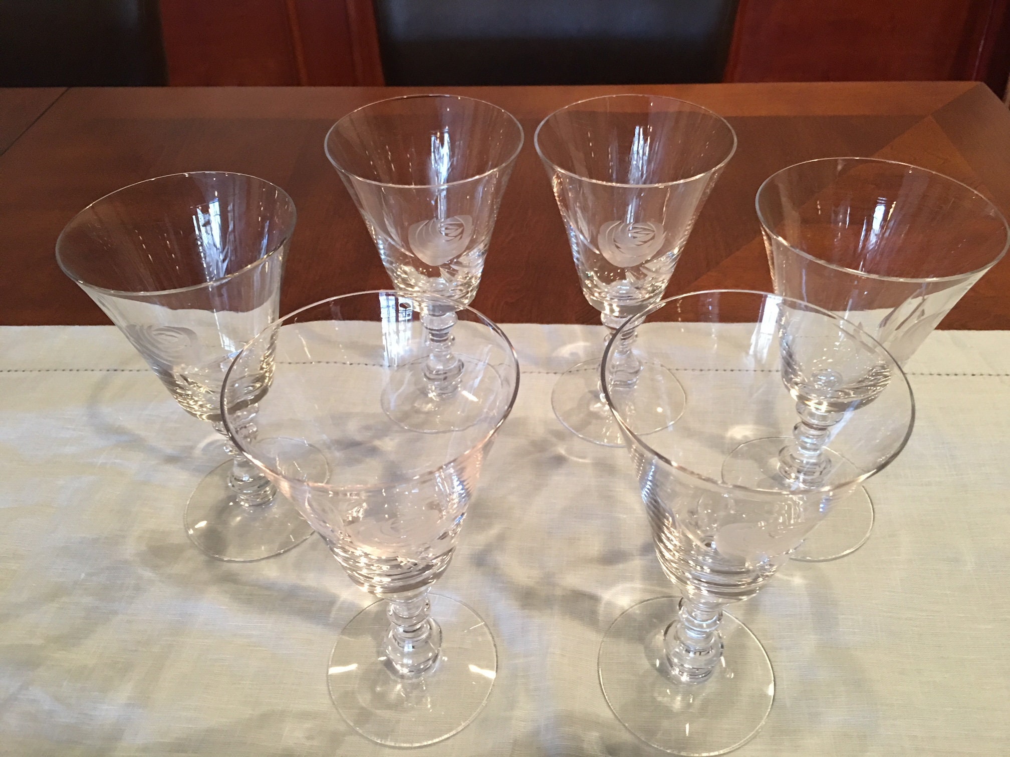 This set of elegant Fostoria Crystal water glasses would make a beautiful addition to your dinnerware. The glasses are each 6 3/4" tall with an exquisite etched Rose bud. They are in almost mint condition with no to little use - no chips or scratches.
